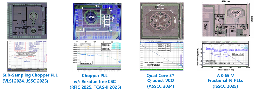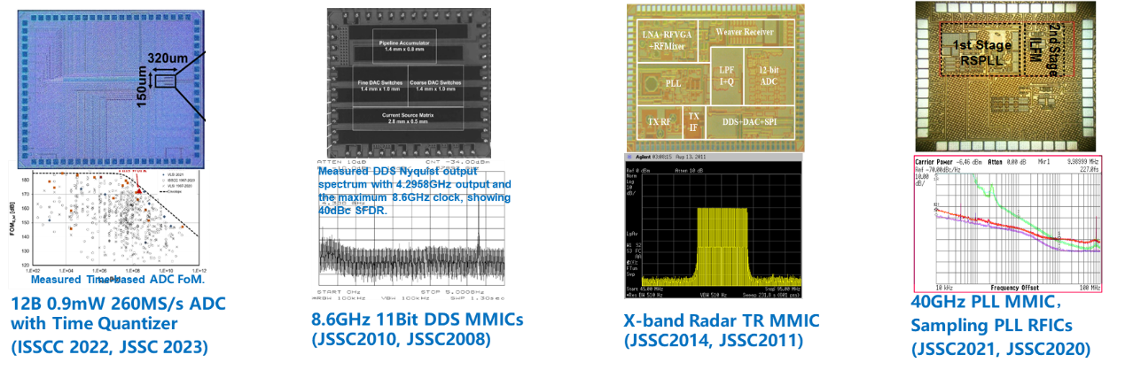 团队在射频领域的研究聚焦于高性能锁相环(PLL)与频率合成器、毫米波雷达、5G/6G无线通信、无线电源传输以及卫星通信等方向。团队致力于开发高精度、低相位噪声的频率合成技术,优化毫米波雷达前端电路和多通道相控阵系统,用于汽车和智能驾驶。团队还研究高效率射频功放、低噪声放大器(LNA)、智能天线以及支持多模多频的射频前端,满足5G/6G和物联网设备的需求。此外,团队积极探索耐辐射、高可靠性的卫星射频链路技术和无线供电系统,为未来无线通信和感知技术提供创新解决方案。