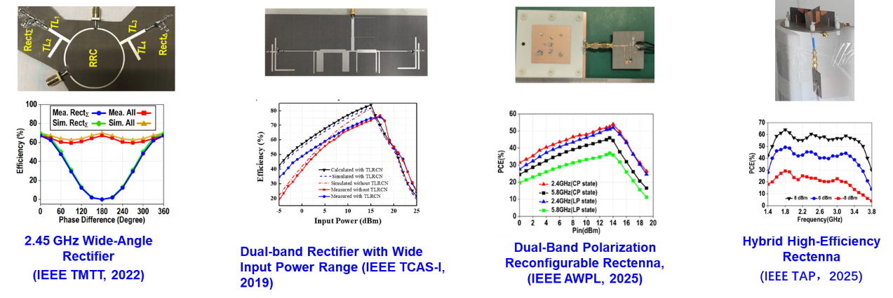 团队在高能效宽功率范围CMOS射频能量收集系统研究方面主要聚焦于高效率整流芯片、高效率低功耗DC-DC芯片、高效率宽波束多功能整流天线等方向。团队致力于开发整流电路功率范围拓展技术、探索新型DC-DC架构,以及能量采集与管理系统的集成化设计方案。为无源物联网节点、人体植入式医疗电子装置以及小型无人飞行器等提供稳定可靠的能量来源。