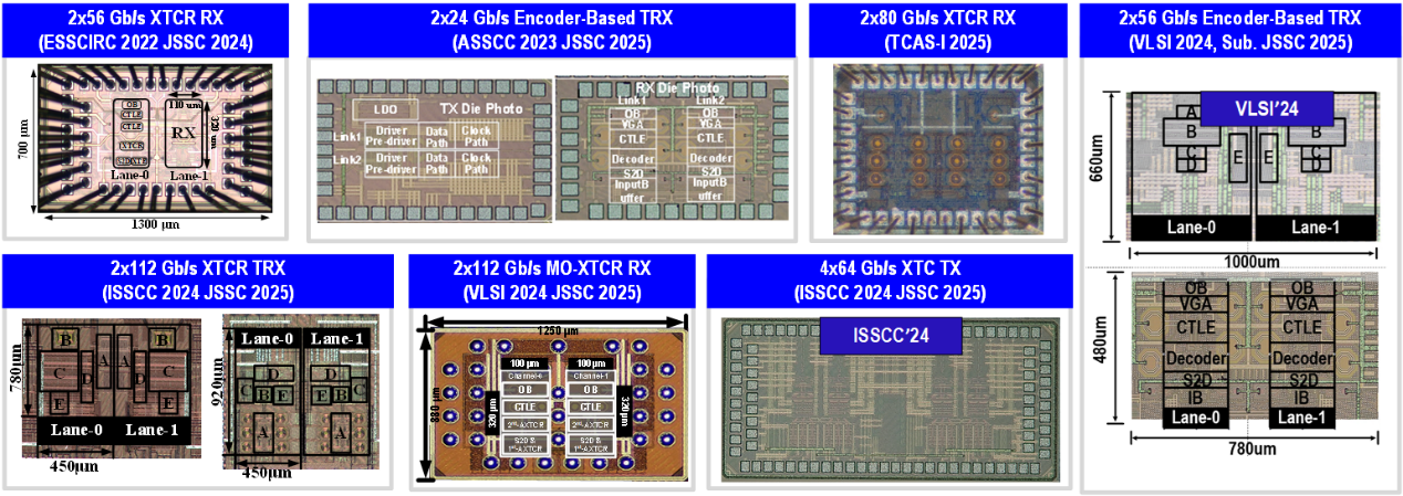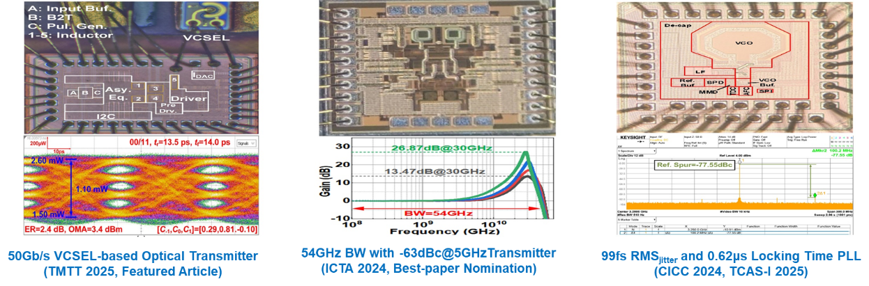 团队在SerDes领域的研究聚焦于高速、多通道信息传输的技术创新,尤其在提高数据速率、降低功耗、优化信号完整性以及高精度、低功耗的信号调制解调方案,进一步提高可靠性。团队致力于开发多通道并行传输系统,通过高速串行传输技术解决数据带宽需求,支持数据中心、5G通信和高性能计算应用。通过改进串行链路中的信号完整性和抖动以及噪声抑制,团队致力于提升数据传输的可靠性与带宽效率。此外,研究还涵盖适应不同通信标准的高速接口技术,以及用于高速光通讯的收发芯片,支持更高频率和更大吞吐量的数据传输,推动服务于高速发展AI的数据中心、高速通信网络及高性能计算系统的发展。