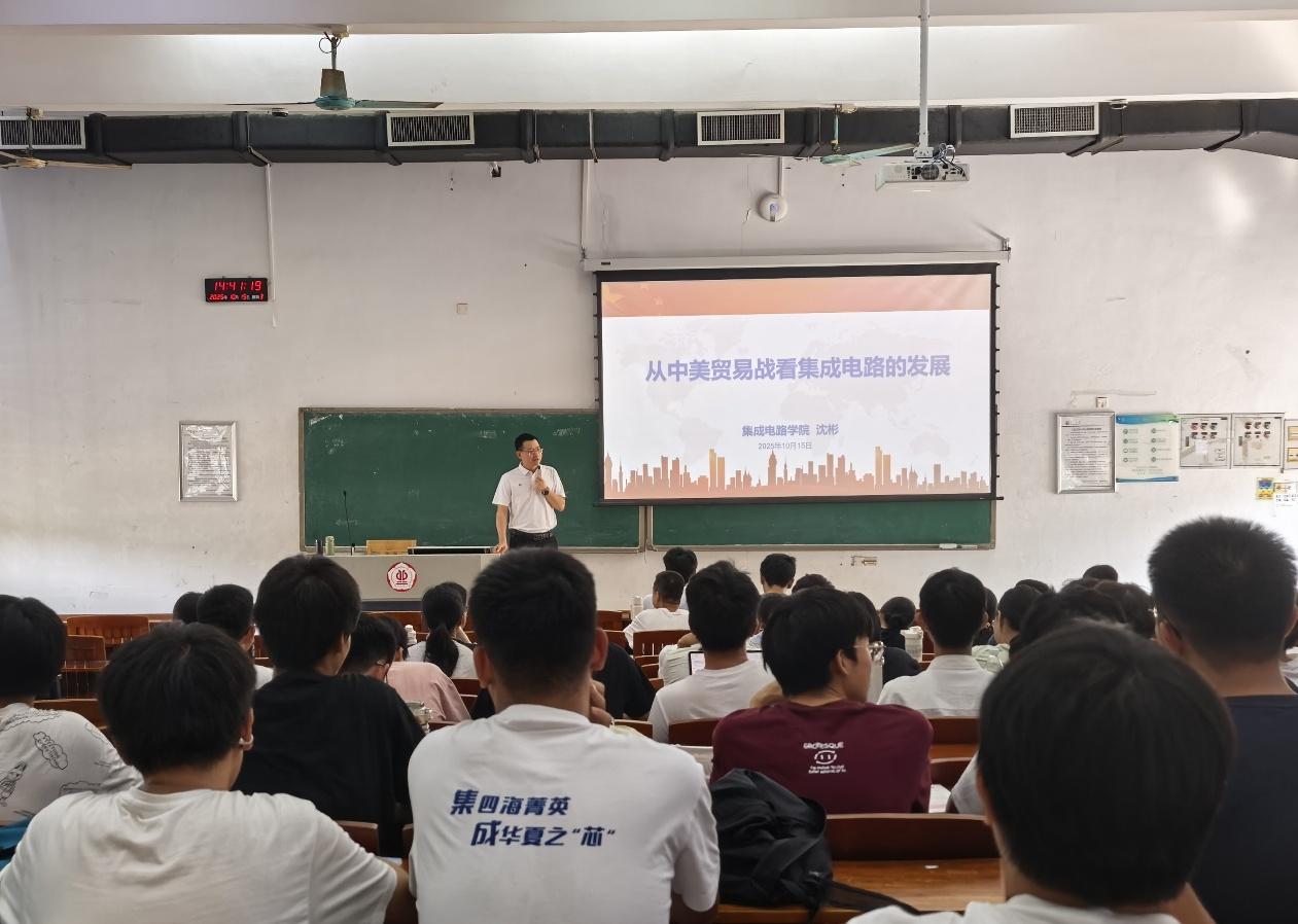 沈彬书记以“从中美贸易战看集成电路的发展”为主题,深入探讨了中美贸易战的深层次原因及其对我国集成电路产业发展、集成电路学子的启示。结合中美之战的最新动态,沈书记分析,中美贸易战深刻反映了全球科技竞争格局的演变,其本质是科技主导权与生态体系之争。他以具体案例阐述了实现科技自立自强对于国家发展的重要性,强调关键核心技术是要不来、买不来、讨不来的,勉励同学们要勇担时代重任,坚定理想信念,在专业学习和科技创新中奋勇争先、在团结凝聚同学中提升自我、在服务社会中实现人生价值。