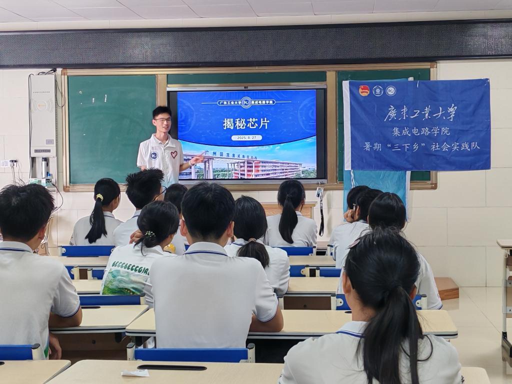 8 月25 日至29日,“芯动清远” 实践团在清远市佛冈县第一中学开展芯片知识普及专项活动。团队先通过问卷调研精准掌握学生需求,定制推出 “芯片制造大闯关”“科学家剧本杀”“智能风扇制作” 等 8项互动实践课程,学生人均参与超6项。活动成效显著:学生对芯片制造流程的认知度从35% 提升至78%,超八成学生实现从 “只闻其名” 到 “能述其理” 的转变,超七成学生科技探索兴趣明显增强,30余名学生明确表示未来有意报考集成电路相关专业。此次活动还获 “学习强国”、今日头条等平台报道,总浏览量超1000次,为基层科技教育注入高校智慧。