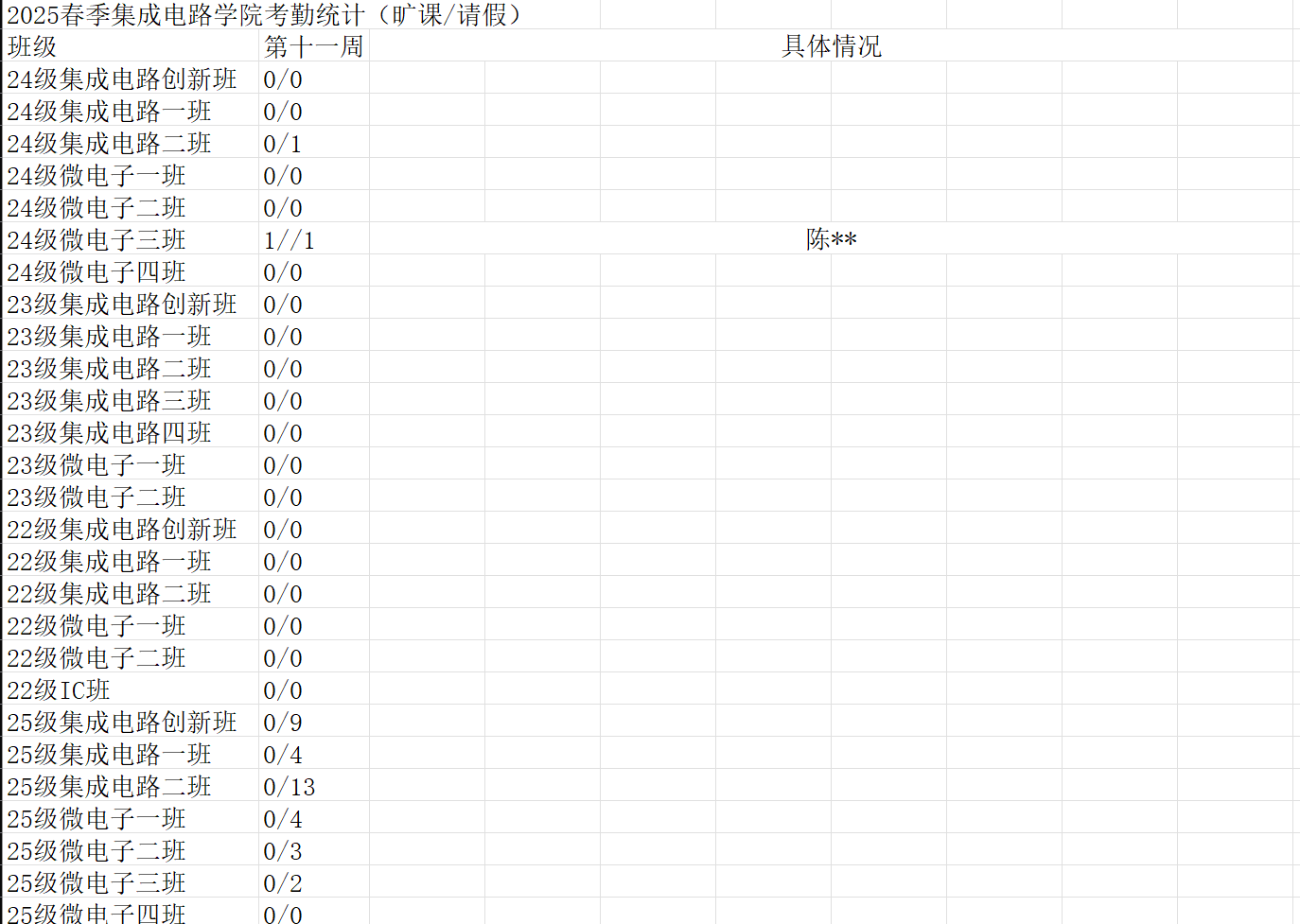 本次统计的是第11周的考勤情况,同学们的积极表现值得肯定和表扬。出勤情况有明显好转,希望同学们保持良好学习习惯,积极学习。