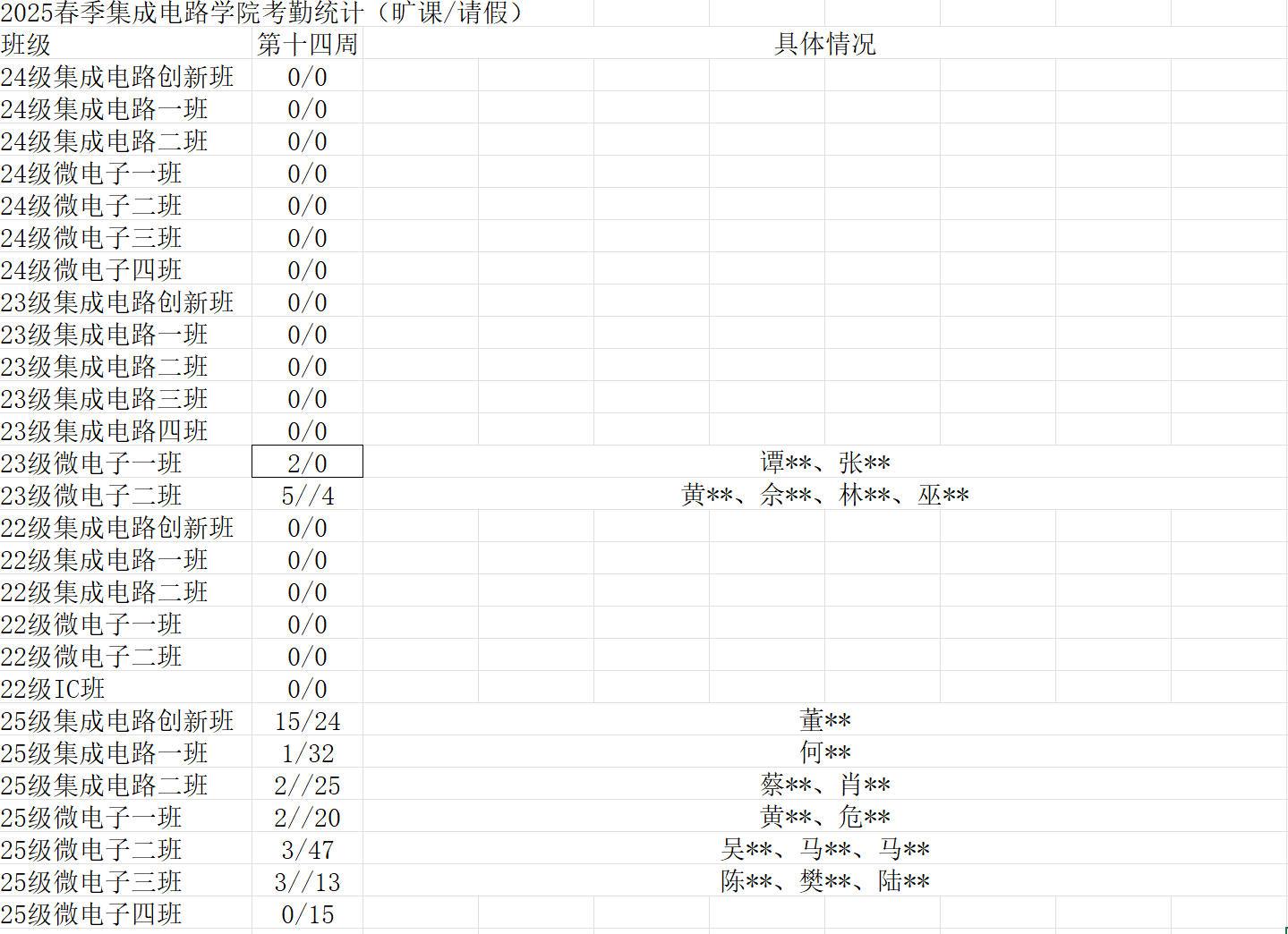 本次统计的是第14周的考勤情况,同学们的积极表现值得肯定和表扬。希望同学们保持良好学习习惯,积极学习。