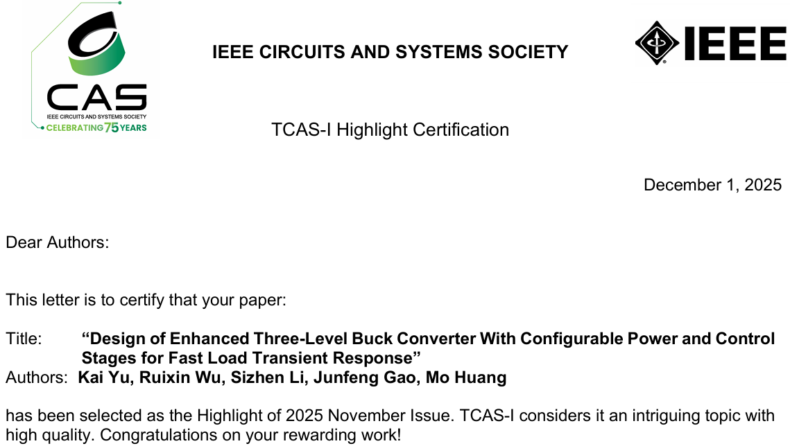 我院在模拟集成电路设计研究领域取得重要进展,研究成果《Design of Enhanced Three-Level Buck Converter with Configurable Power and Control Stages for Fast Load Transient Response》在集成电路设计领域国际权威期刊《IEEE Transactions on Circuits and Systems I: Regular Papers》上发表。