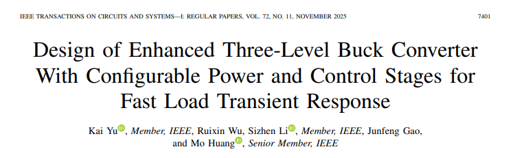 [1] Yu, Kai; Wu, Ruixin; Li, Sizhen; Gao, Junfeng; Huang, Mo. Design of Enhanced Three-Level Buck Converter With Configurable Power and Control Stages for Fast Load Transient Response. IEEE TRANSACTIONS ON CIRCUITS AND SYSTEMS I-REGULAR PAPERS, 2025, 72(11):7401-7410.