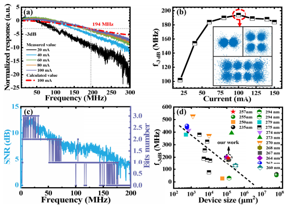 发光波长为257 nm的深紫外发光二极管(DUV LED)存在严重的量子限制斯塔克效应,导致有源区中电子-空穴波函数分离,辐射复合率大幅度降低。针对该问题,研究团队创新性地提出利用超薄量子阱结构的强量子限域效应缩短电子-空穴辐射复合寿命,并开发了量子限域频率调制物理模型;把尺寸为350微米×350微米DUV LED的-3 dB带宽提升至194 MHz,所研制的DUV LED在低频段也展现出高的信噪比。研究团队认为,当器件尺寸进一步减小后,基于该技术方案研制的DUV LED的-3dB带宽有望提升至500 MHz以上,为未来非视距紫外通信的应用奠定了重要基础。