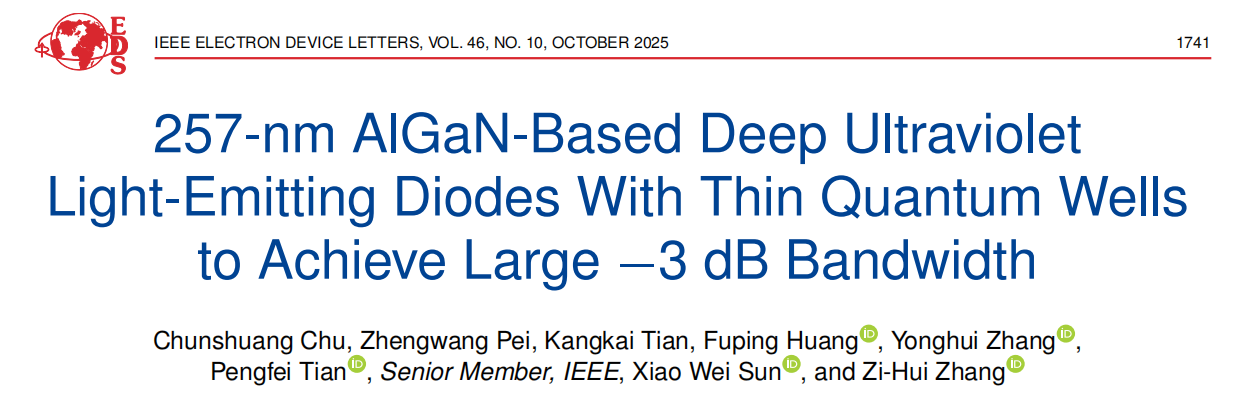 [1] Chu, Chunshuang; Pei, Zhengwang; Tian, Kangkai; Huang, Fuping; Zhang, Yonghui; Tian, Pengfei; Wei Sun, Xiao; Zhang, Zi-Hui. 257-nm AlGaN-based deep ultraviolet light-emitting diodes with thin quantum wells to achieve large -3 dB bandwidth. IEEE Electron Device Letters, 2025, 46(10):1741-1744.
