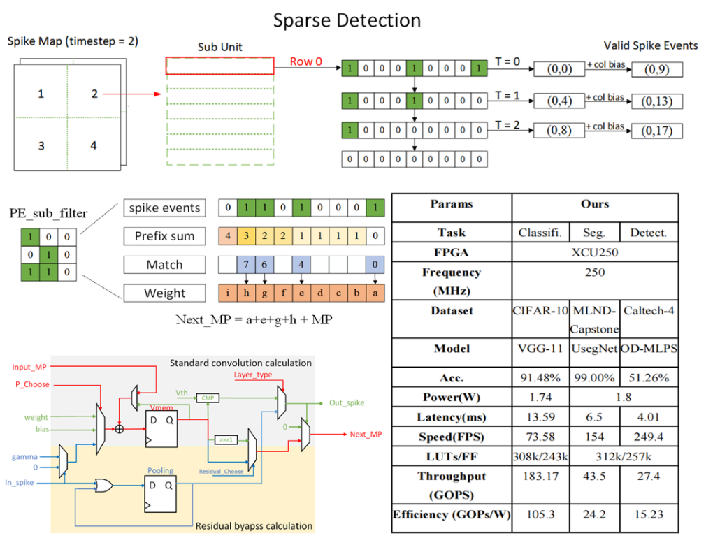 该架构创新性地从脉冲计算本质出发,在设计层面引入全局与局部分离的双层级稀疏脉冲检测机制,并配套轻量级稀疏响应单元,实现对脉冲信号在时间与空间维度上的冗余进行快速捕获与高效利用。同时,系统提出的可重构脉冲卷积数据流能够根据网络拓扑自适应切换稀疏检测策略,并动态调整脉冲神经元的脉冲触发与权重输入路径,以灵活支持多样化的卷积操作,涵盖标准、转置、空洞及残差卷积等多种结构形式,显著增强了系统的模型兼容性与结构适应能力。