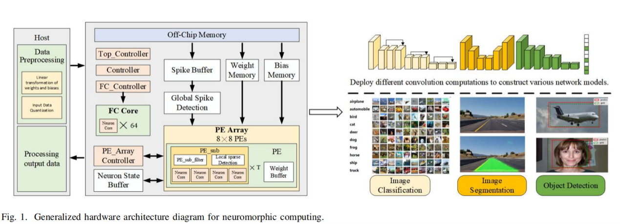 随着脉冲神经网络(SNN)在视觉识别、图像分割和目标检测等复杂智能任务中不断取得突破,其整体性能已逐步接近甚至达到传统卷积神经网络的水平。如何以低功耗方式实现多样结构SNN模型的高效计算,成为推动其实际应用的关键技术挑战。然而,现有多数SNN加速器难以适配多种卷积类型和不同网络拓扑,导致模型性能无法充分发挥,限制了其在边缘智能等资源受限场景中的落地。针对这一挑战,团队提出一种新型可重构神经形态架构SConvNSys,旨在高效加速面向多类应用场景的脉冲卷积神经网络(SCNN)。