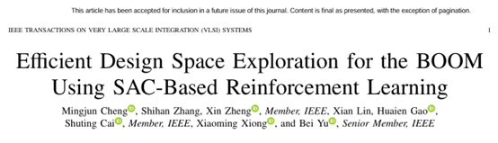 我院熊晓明教授团队在集成电路与系统设计领域的国际权威期刊《IEEE TRANSACTIONS ON VERY LARGE SCALE INTEGRATION (VLSI) SYSTEMS》(TVLSI)发表研究论文,题为《Efficient Design Space Exploration for the BOOM Using SAC-Based Reinforcement Learning》。